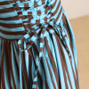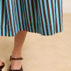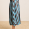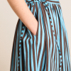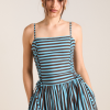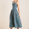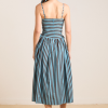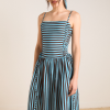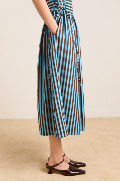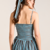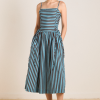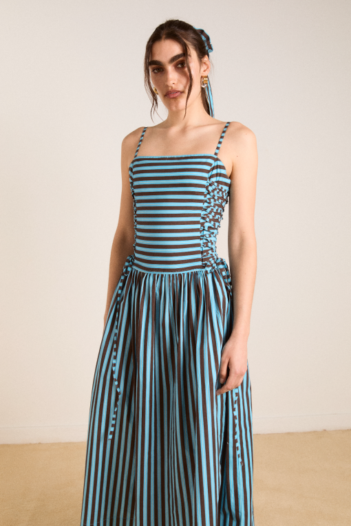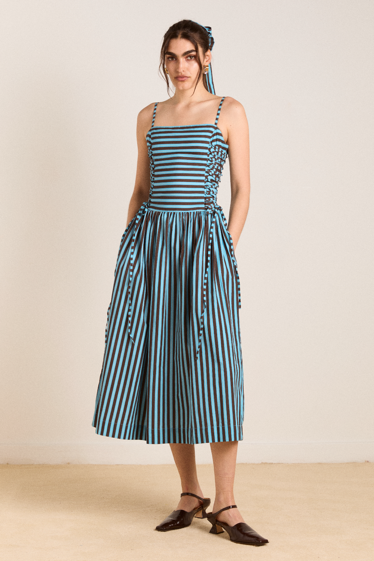 Meet the Angelina Midi Dress in blue choc stripe. Cut from crisp 100% organic cotton, its voluminous skirt silhouette is balanced by delicate spaghetti straps and a fitted bodice. Featuring side seam pockets, the Angelina is a statement piece that can be taken from day to night with ease.