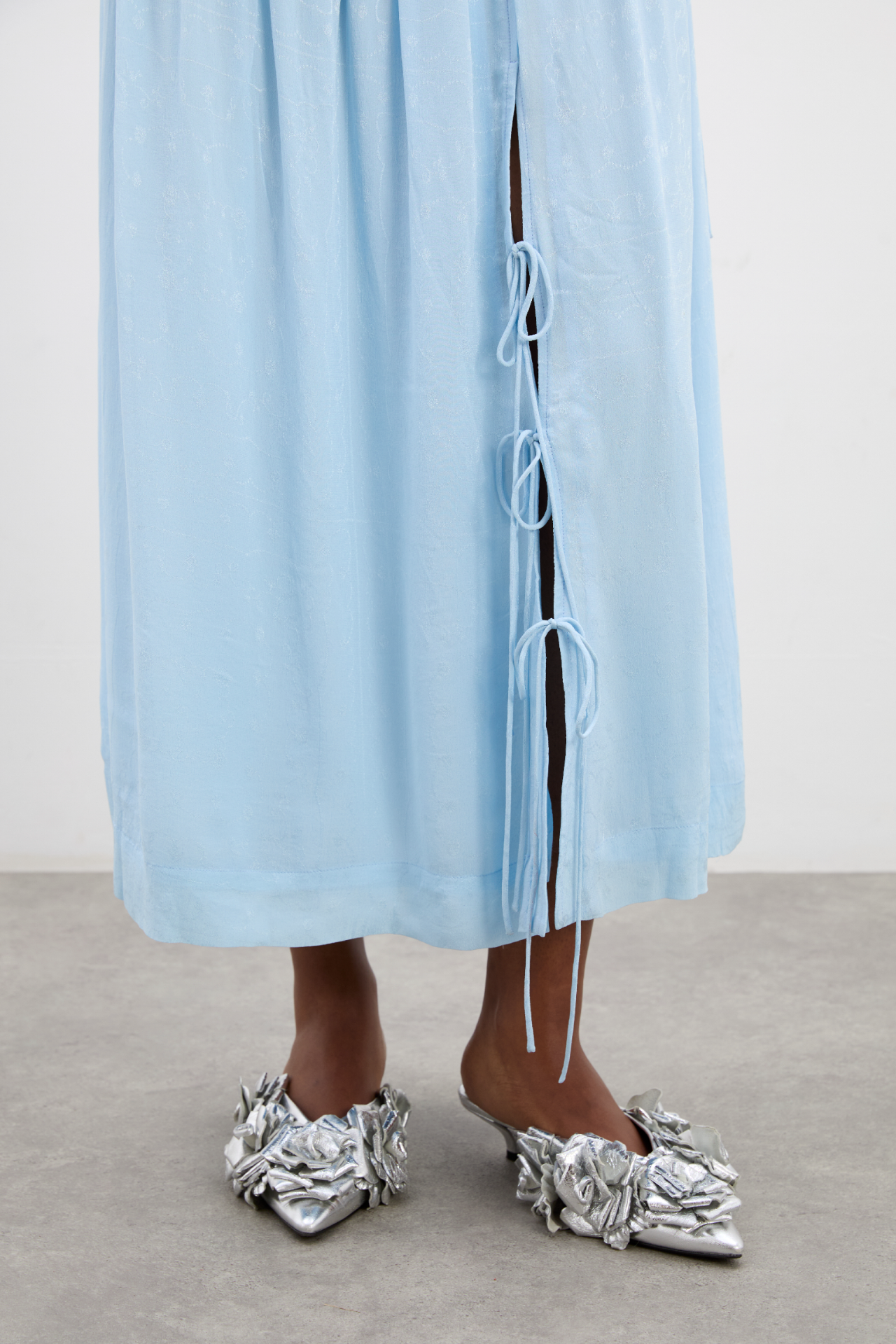 In a sweet sky blue shade, our Charlotte Midi Skirt is effortlessly floaty and feminine. Featuring a side split with bow fastenings and an elasticated waist for comfort. Pair with the matching Charlotte Cami for ultimate impact.