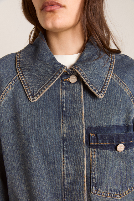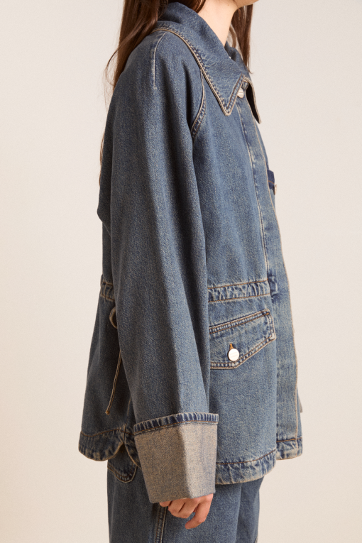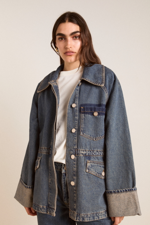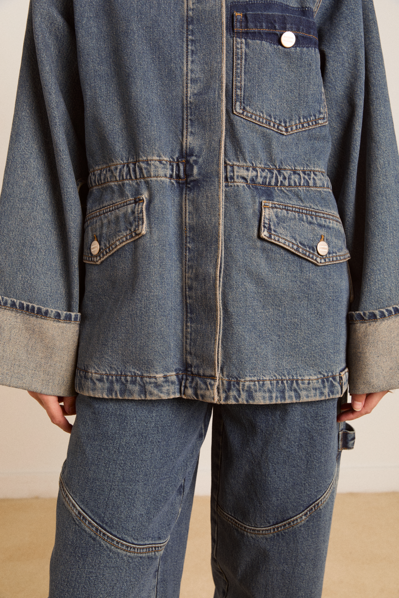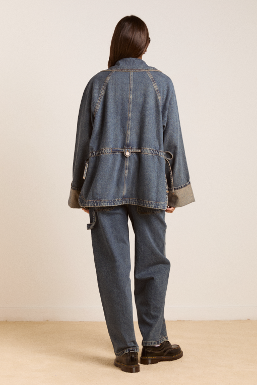 A perfect mix of tailored and oversized, our Emilie Workwear Jacket in vintage wash features a drawstring waist to create a cinched silhouette. Made from 100% organic cotton, and crafted with a shadow detail pocket, raglan shoulder and concealed placket with shank fastening. Pair with our matching Drew Jeans for a complete head-to-toe look.