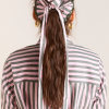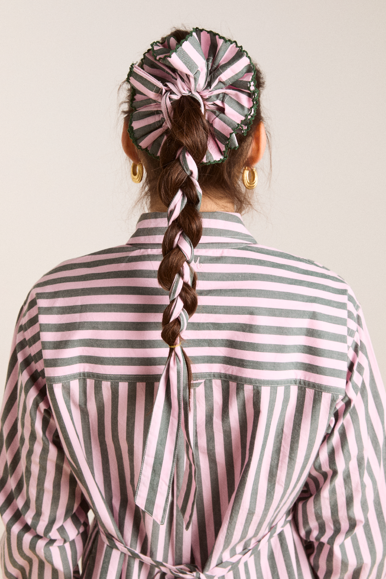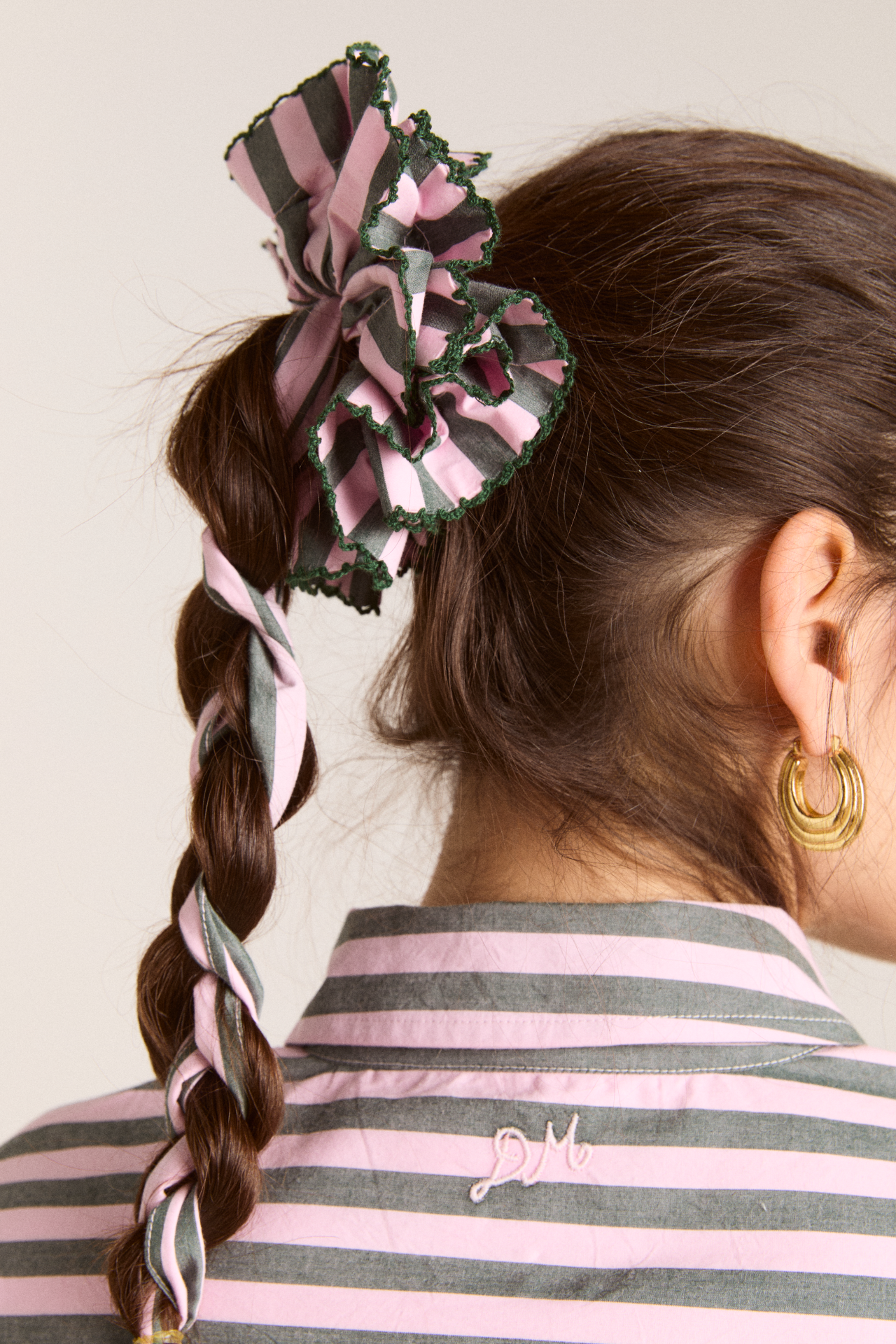 Versatile and stylish, the Garter Bun Wrap in garden tulle stripe can be worn two ways. Crafted from 100% organic cotton, it is designed to weave through your plait or tie into a bow. Finished with a contrast trim edge and our signature embroidered DM logo.