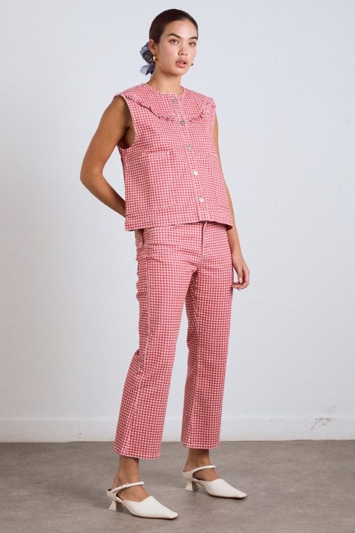 Our cropped kick leg Kenny Jeans are back in a new red gingham print. Designed in London, they are crafted from a stretch denim and feature signature Damson Madder embroidery on the back pockets. Pair with the matching Mari Gilet.
