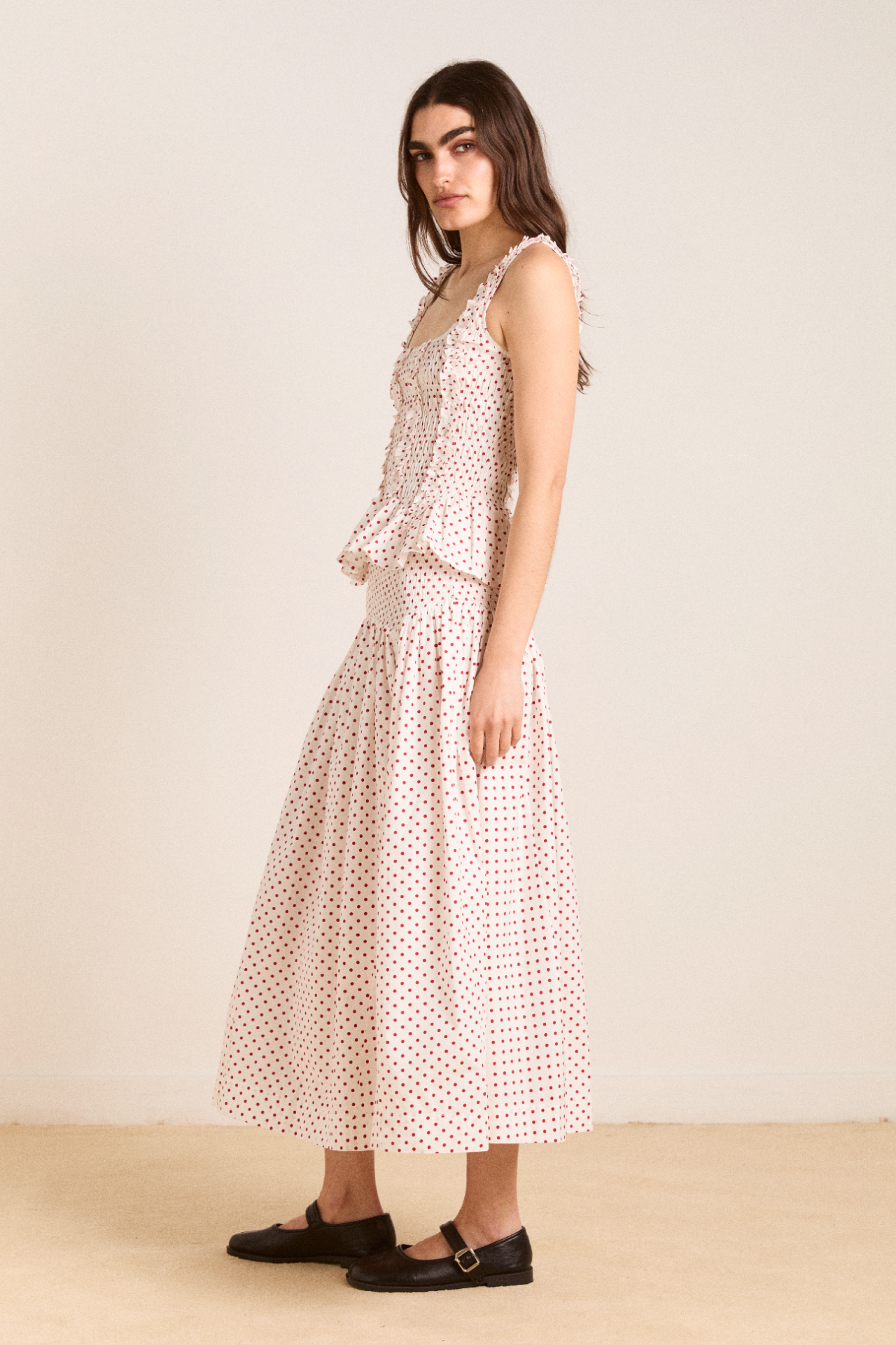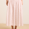 Falling to a midi length, the Layla Skirt in off white and red spot is a transeasonal staple. Featuring a dropped waist, with a shirred elasticated waistband, this skirt is comfortable and stylish. Pair with our Raphi Cami or Leilani Blouse for a full head to toe look.