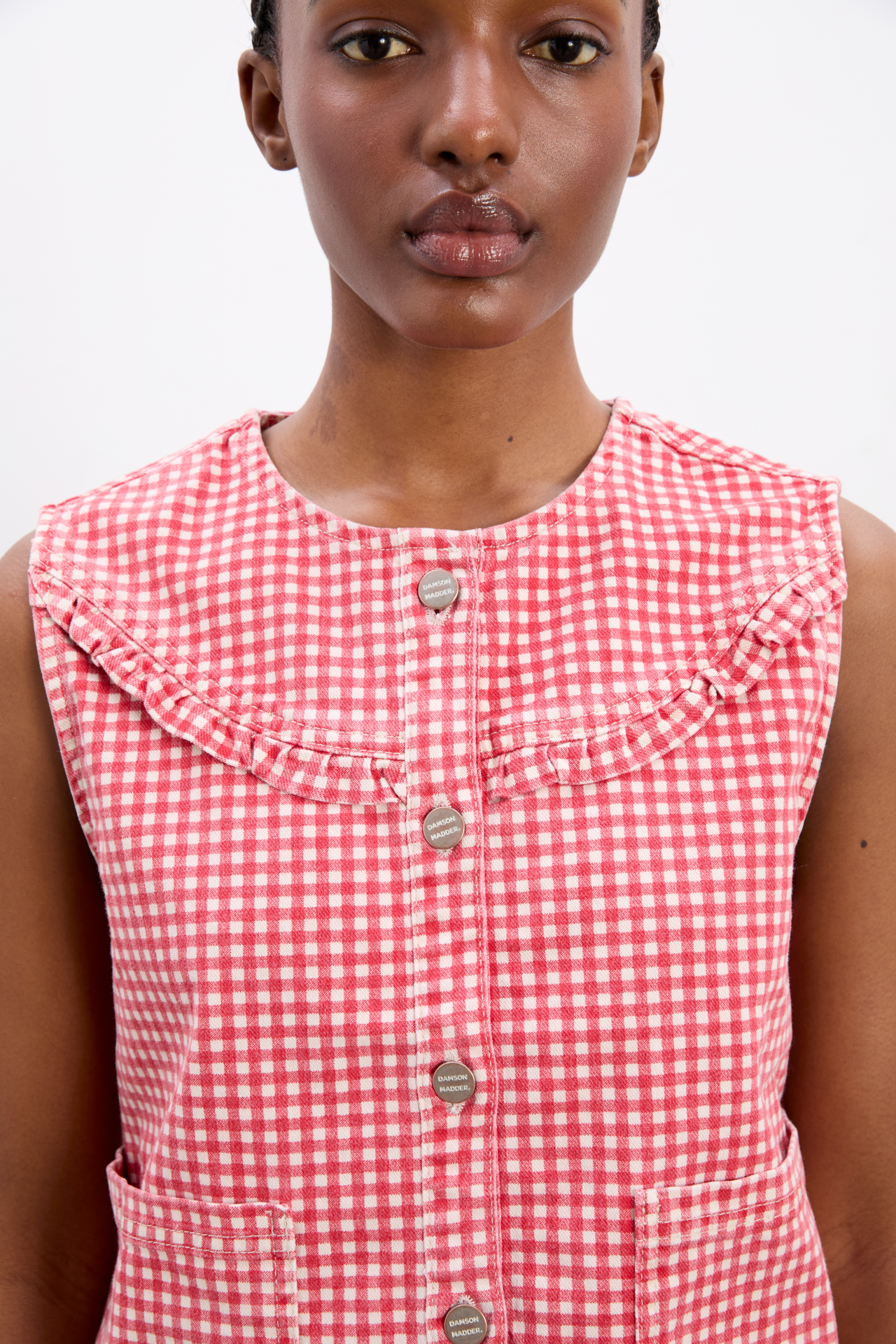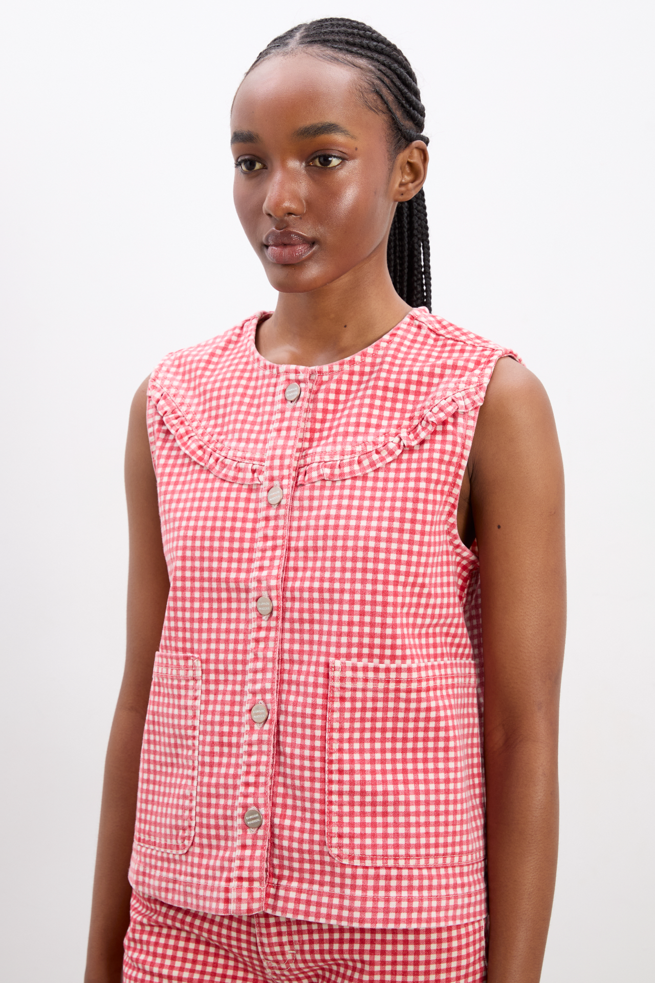 Maintaining a clean, streamlined silhouette, elevated by our custom red gingham print and ruffle detailing, the Mari vest top is a chic, sleeveless summer staple. Pair with our matching Kenny Jeans or Capri Jeans for a bold summer co-ord.