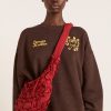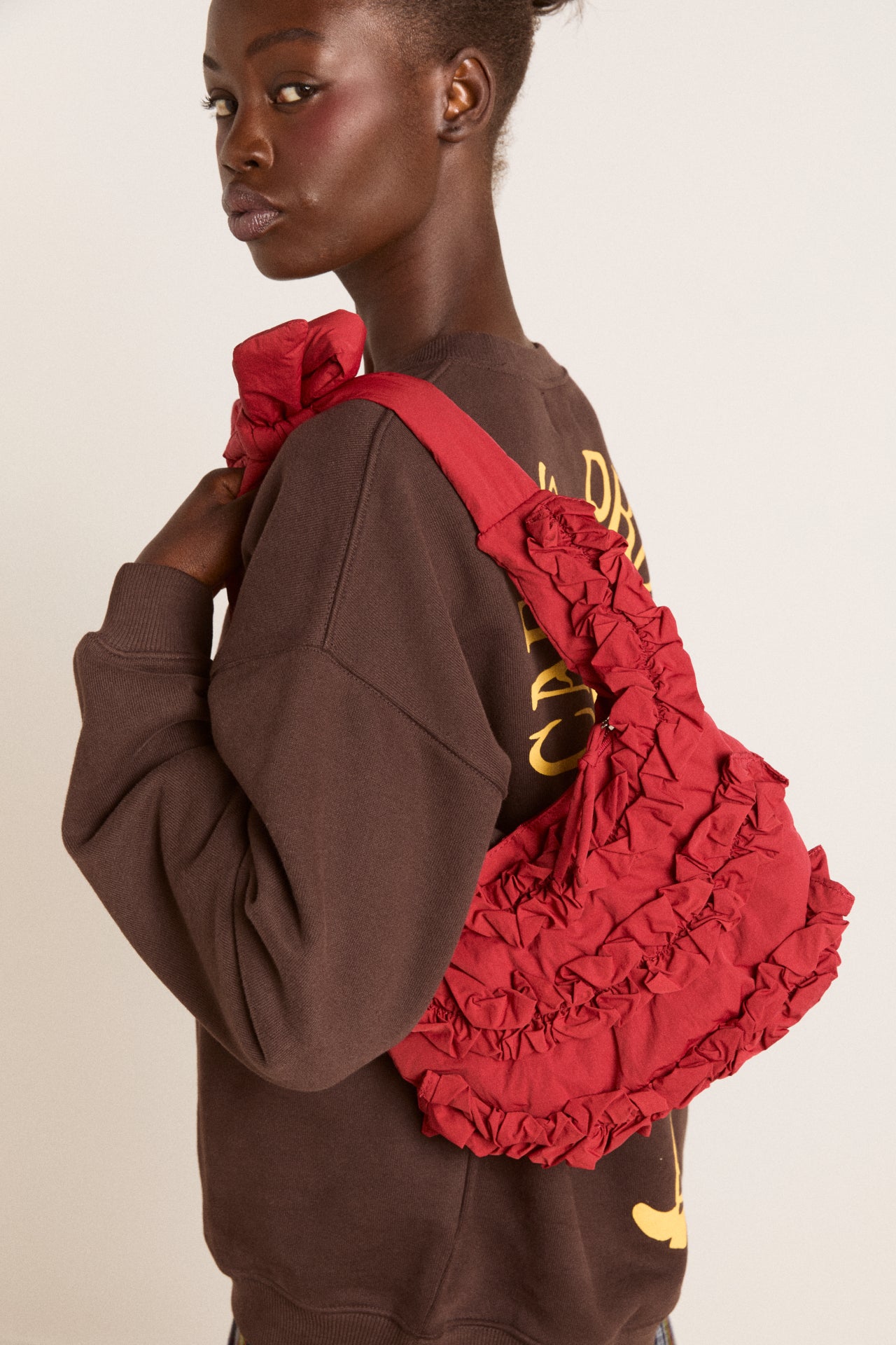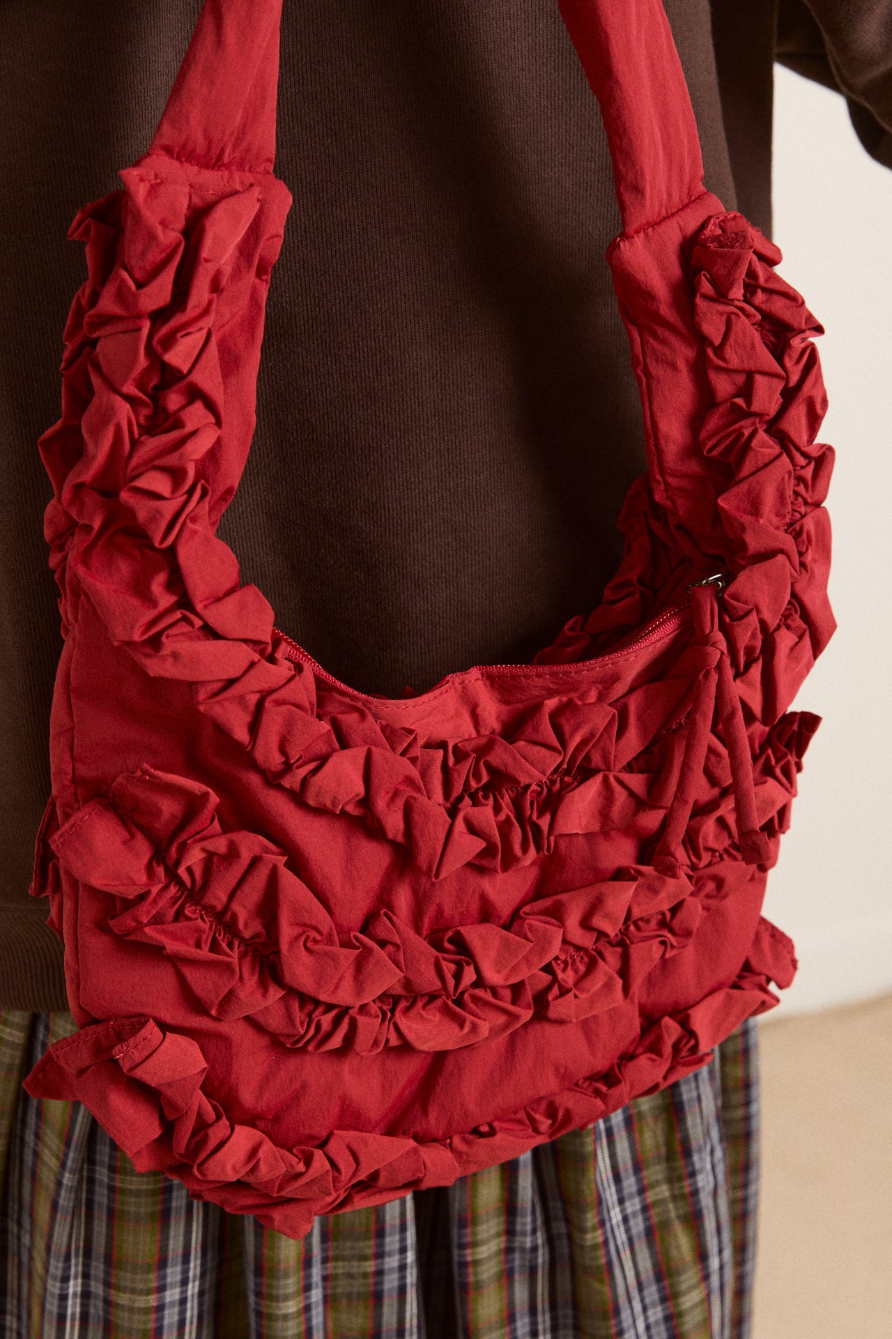 Complete your look with the best selling Quinn Slouchy Bag in red. Featuring romantic ruffle detailing and a zip closure. The adjustable tie up straps offer style and versatility, making this the perfect day to night bag. Can be worn cross body.