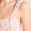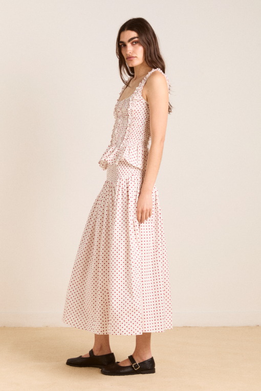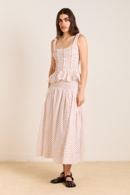 The Raphi Cami in off white and red spot is a sleeveless, square neck top with a shirred bodice and peplum hem. Finished with ruffle detailing for a feminine, vintage touch. Made from 100% organic cotton, it pairs perfectly with the Layla Skirt in off white and red spot.