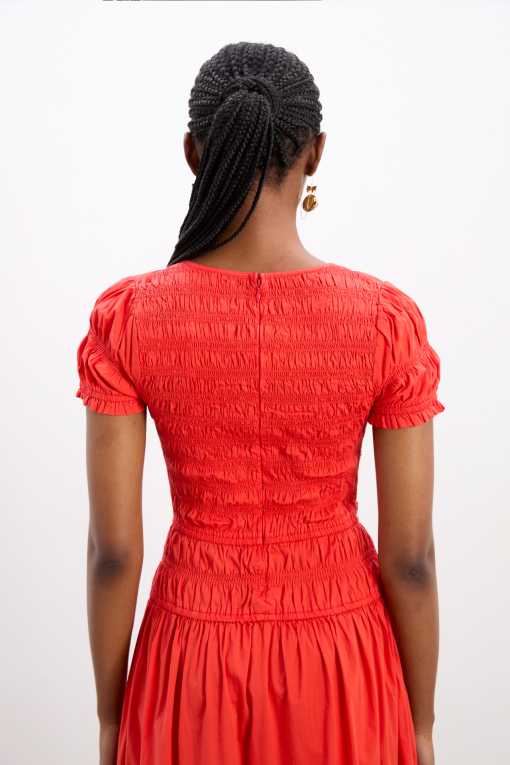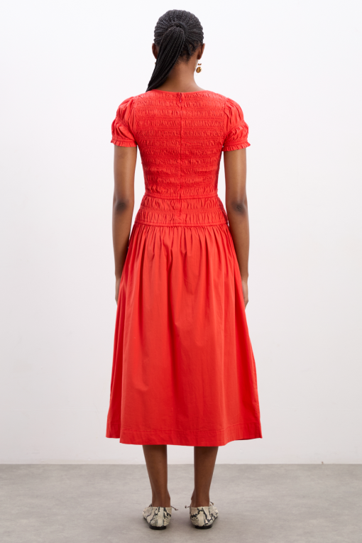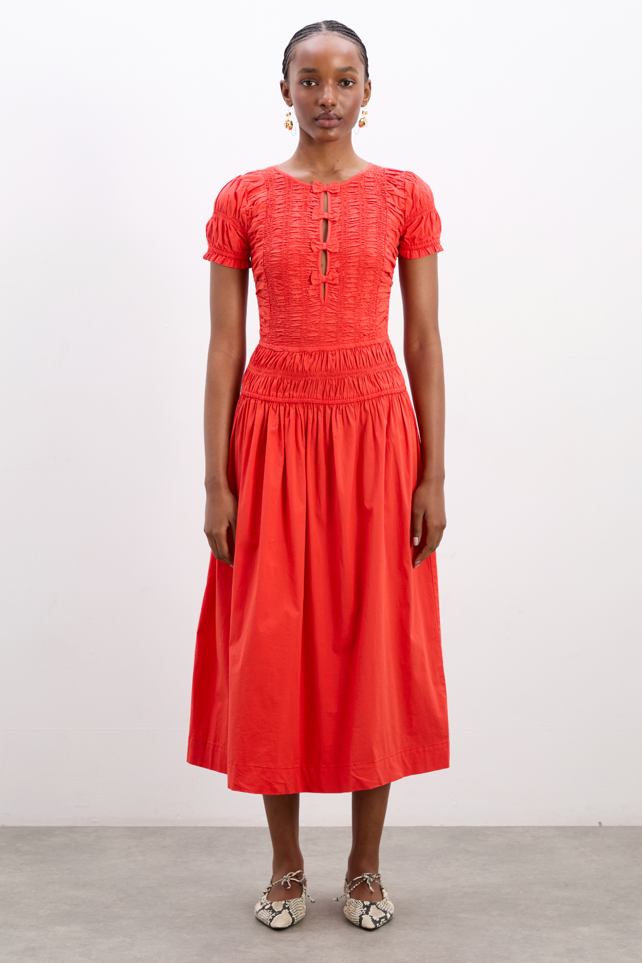 With its flattering drop waist silhouette, short puff sleeves, and bow detailing, the Saffy Midi Dress dress exudes timeless femininity. Crafted from organic cotton, this dress is beautifully accented with shirred detailing for a refined finish.