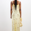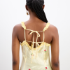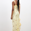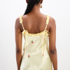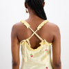 The Simone Slip Dress in butter yellow combines an all over cherry embroidery design with a beautifully draped bias-cut recycled fabric. Complete with ruffle detailing at the neckline and adjustable straps, this is the perfect dress for an evening event or formal occasion. Pair with our matching Simone Satin Scrunchie Bag. Due to the delicate nature of this garment, snagging can occur. Take care when wearing