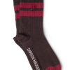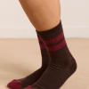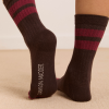 Meet our signature sporty calf length socks in choc and burg stripe. Crafted from 75% organic cotton, 23% recycled nylon, and 2% elastane, offering a perfect blend of comfort, durability, and a touch of stretch. The soft, organic cotton ensures a gentle feel against the skin, while the nylon and elastane contribute to enhanced flexibility and shape retention.