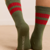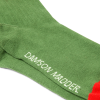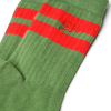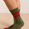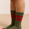 Meet our signature calf length socks in olive and red stripe print. Crafted from 75% organic cotton, 23% nylon, and 2% elastane, offering a perfect blend of comfort, durability, and a touch of stretch. The soft, organic cotton ensures a gentle feel against the skin, while the nylon and elastane contribute to enhanced flexibility and shape retention.