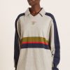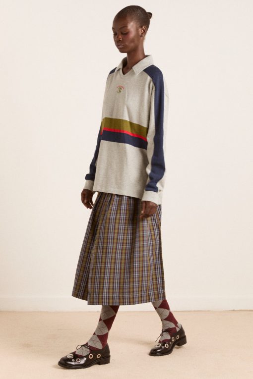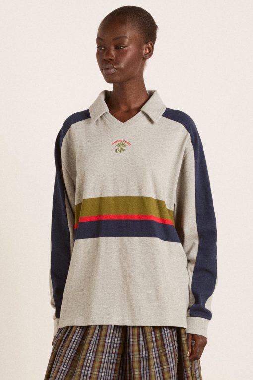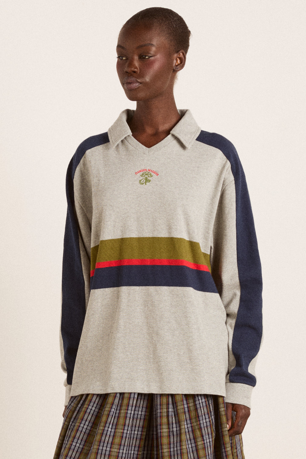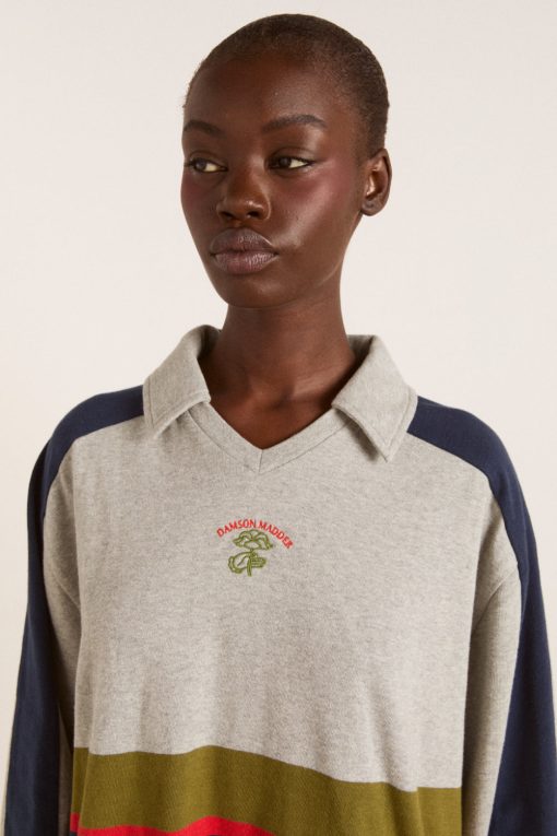 Introducing your new weekend wardrobe go-to. The Verity V-Neck Rugby in placement stripe reimagines the classic rugby. Crafted from 100% organic cotton, the Verity is a relaxed fit jumper featuring contrast arm stripes, placement front stripes and cuffed sleeves, effortlessly combining comfort with style.